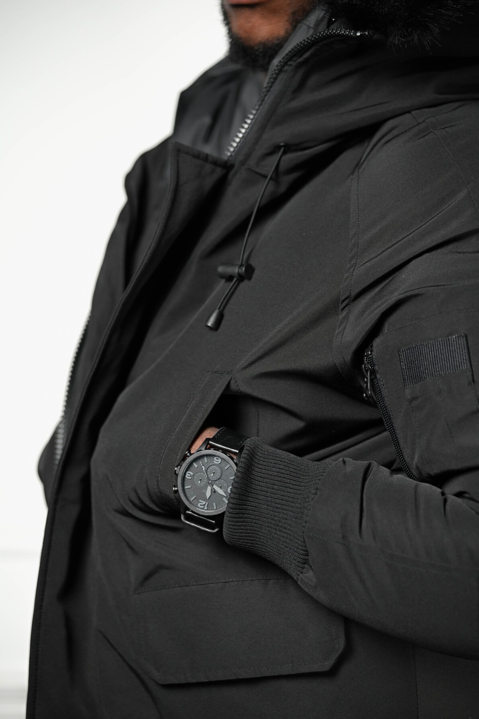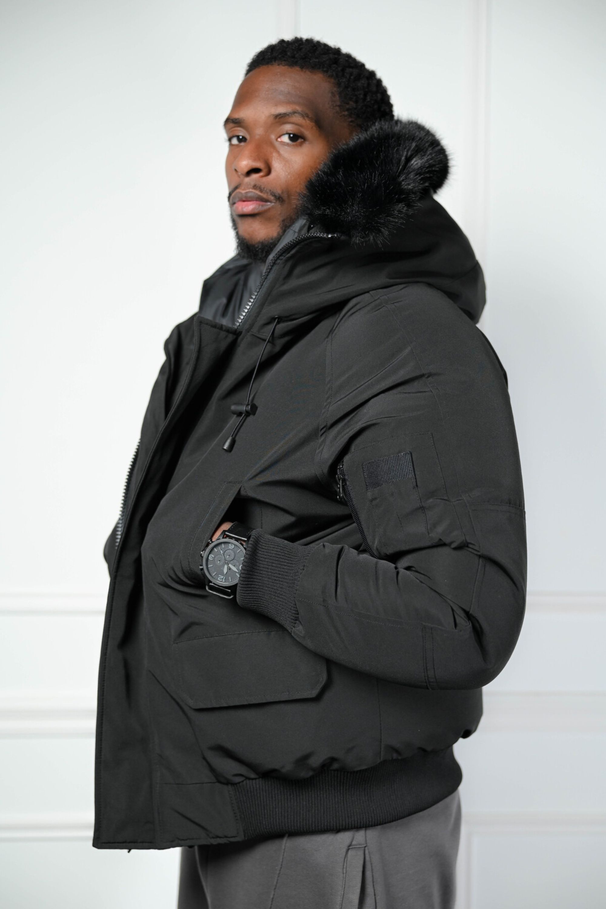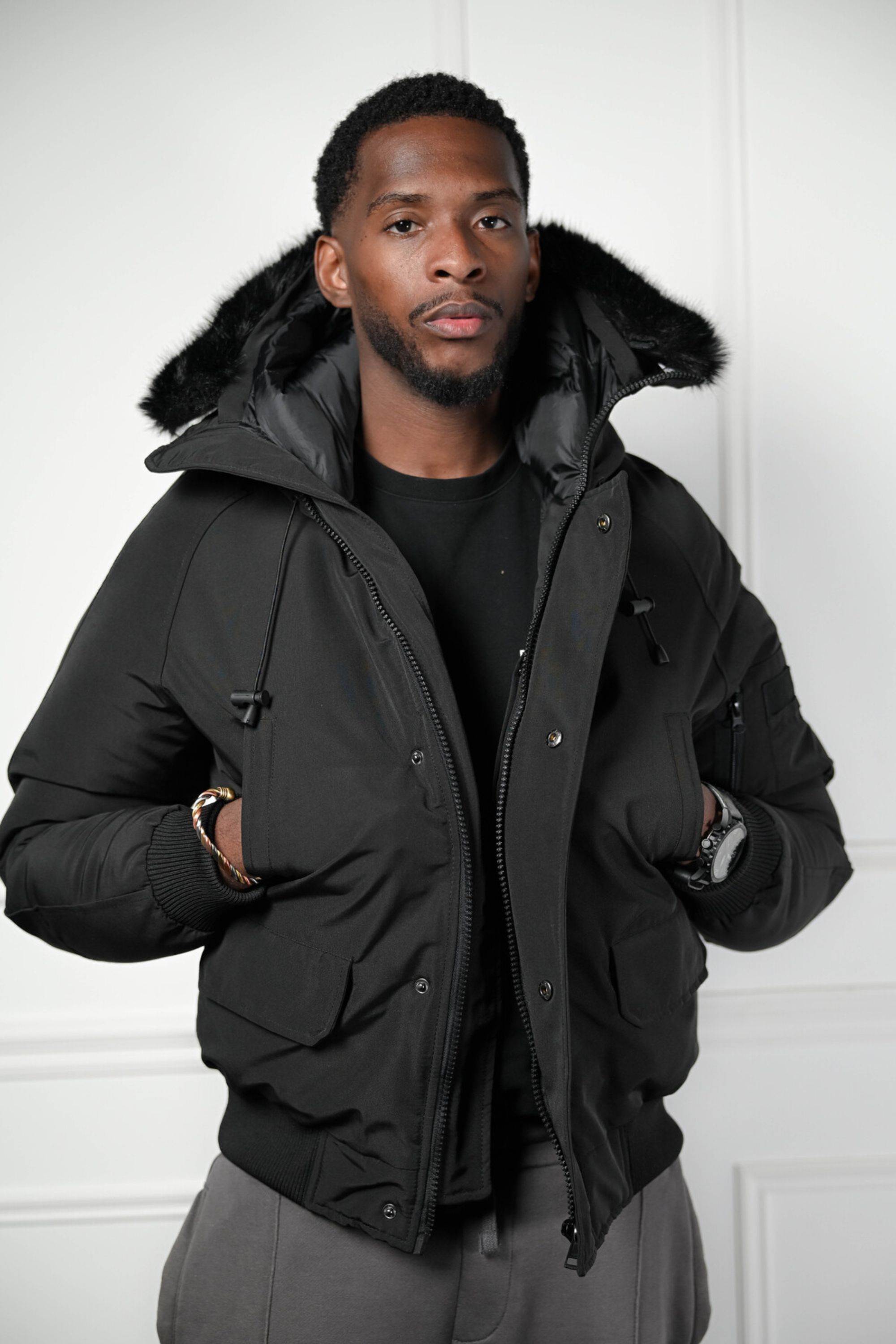 - Ruta del producto Página delantera Chaquetas de hombreChaquetas de invierno para hombre Abrigo de invierno negro con capucha de piel sintética Jerone