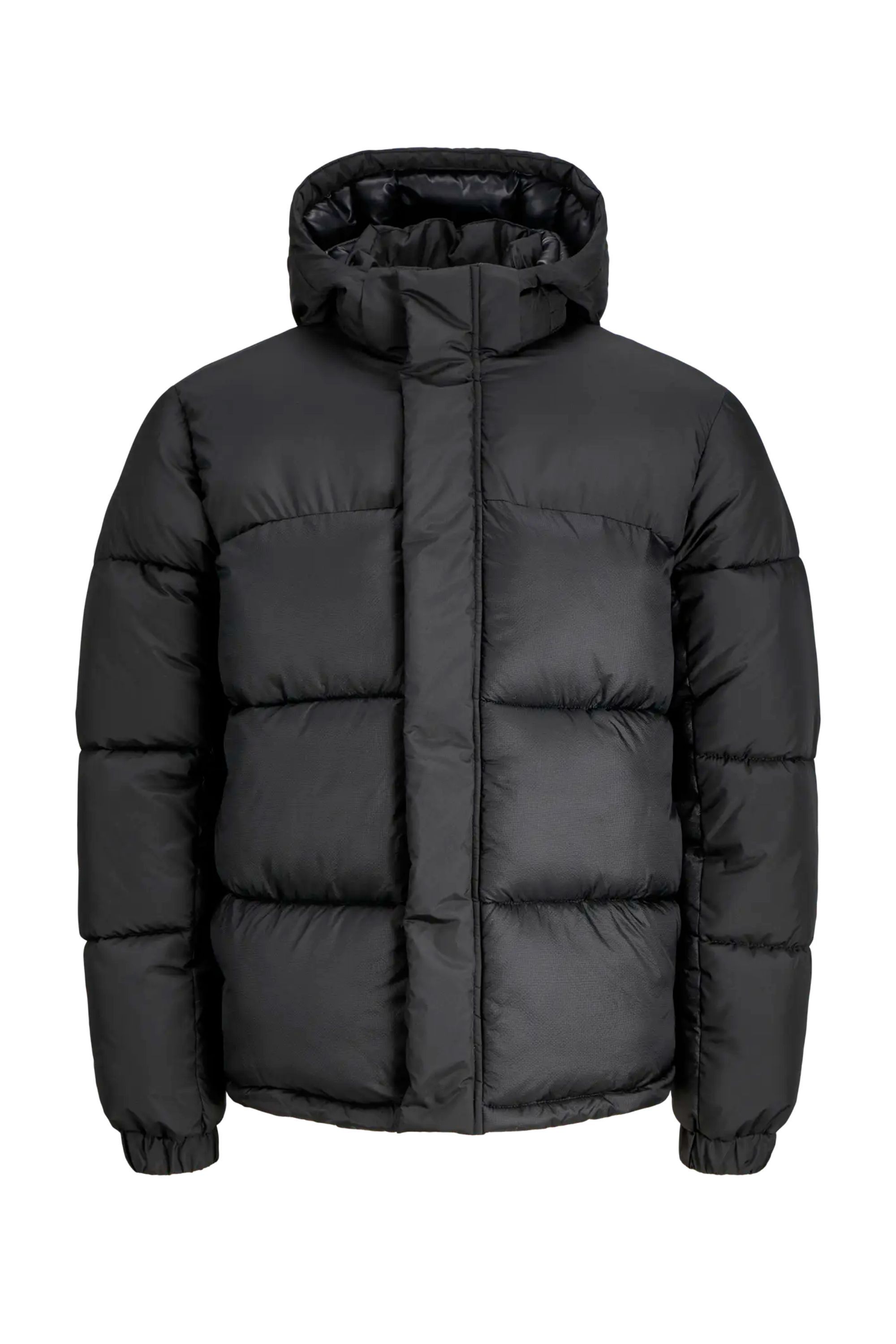 Chaqueta acolchada negra para hombre de JACK & JONES. Una opción ligera y cálida para los cambios de clima en primavera. Tejido duradero, resistente al agua y al viento. Capucha desmontable, cierre de cremallera y puños elásticos que garantizan un ajuste cómodo.