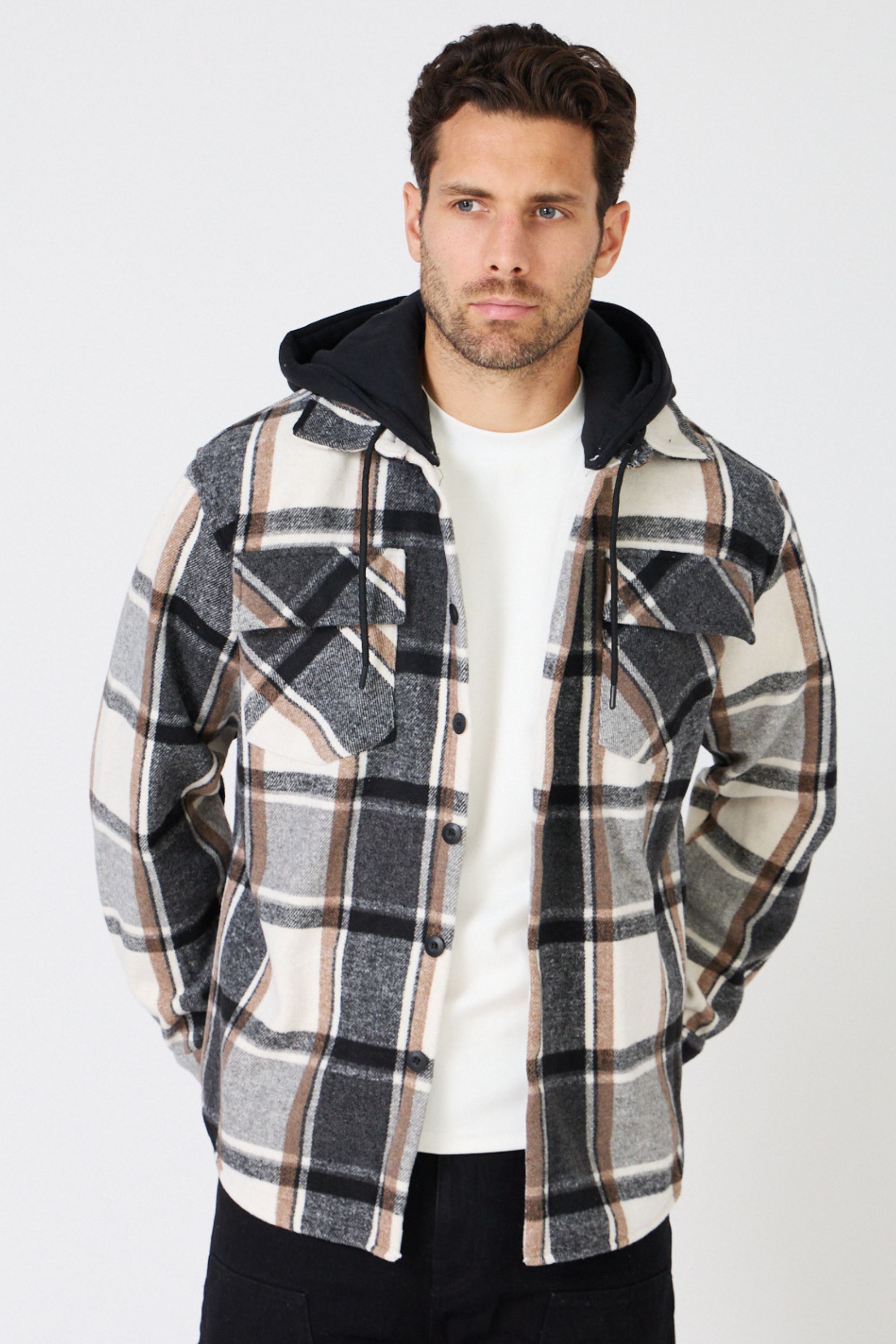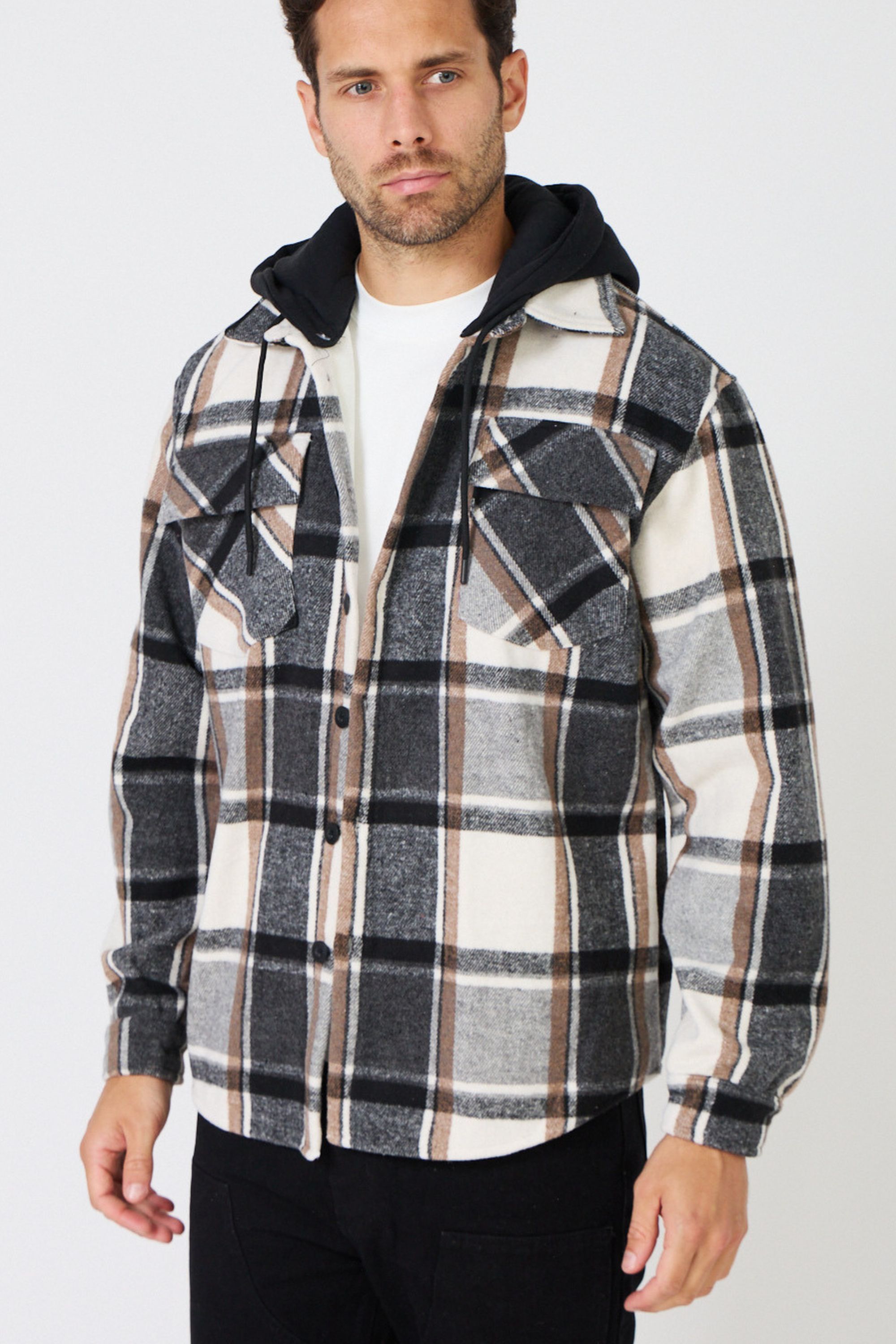 - Ruta del producto Página delantera Chaquetas de hombreChaquetas ligeras de hombre Chaqueta con capucha a cuadros Jerone