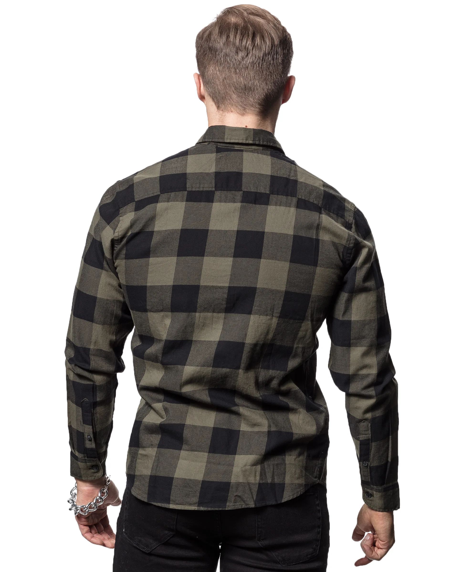 Camisa de cuadros verde y negra para hombre de la marca JACK&JONES. Camisa elegante para el día a día y el tiempo libre. Se puede llevar abierta o cerrada, combínala por ejemplo con unos vaqueros negros y una chaqueta de cuero. Cierre clásico con botones, logo en el dobladillo. Corte slim fit.
