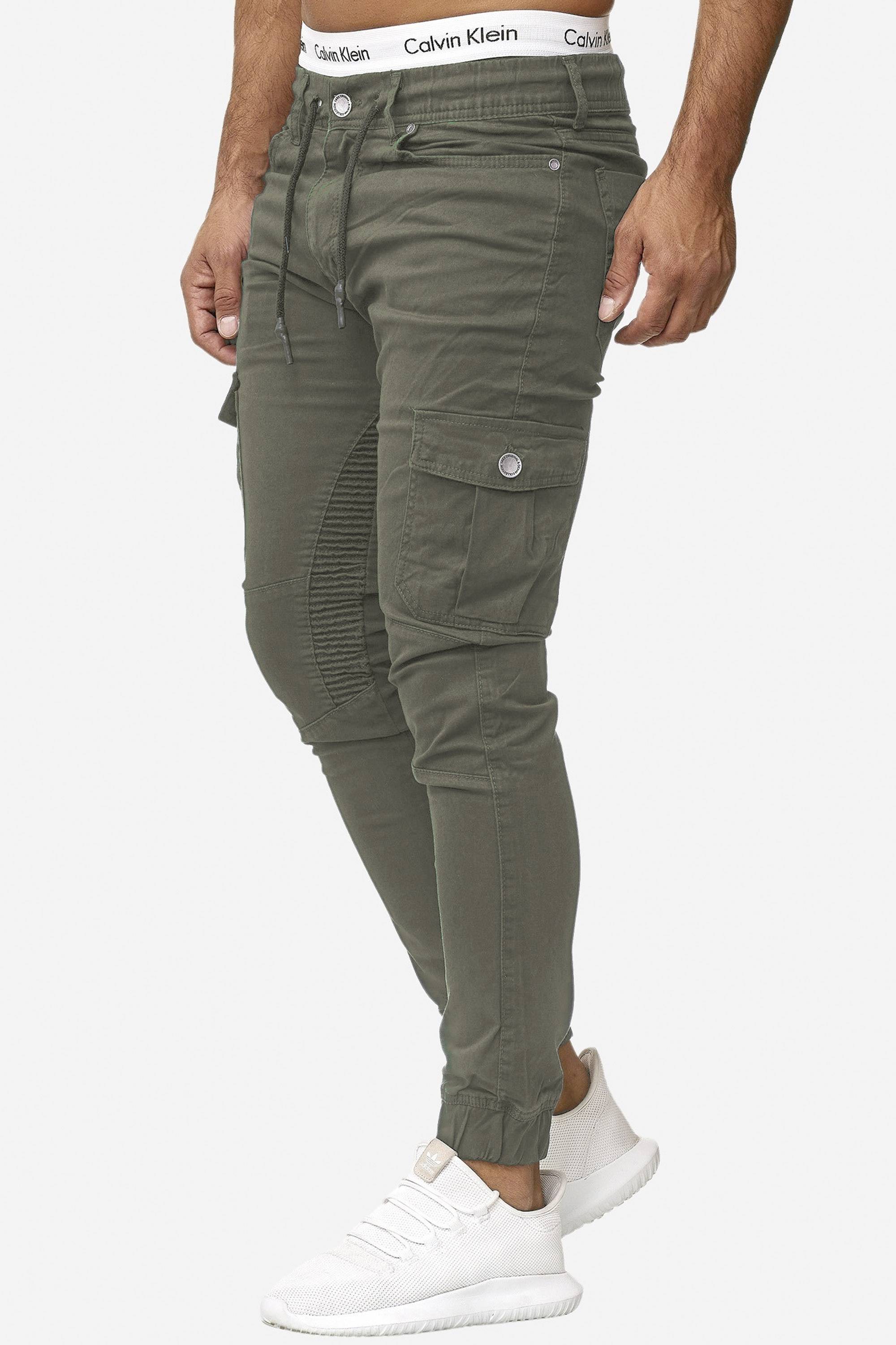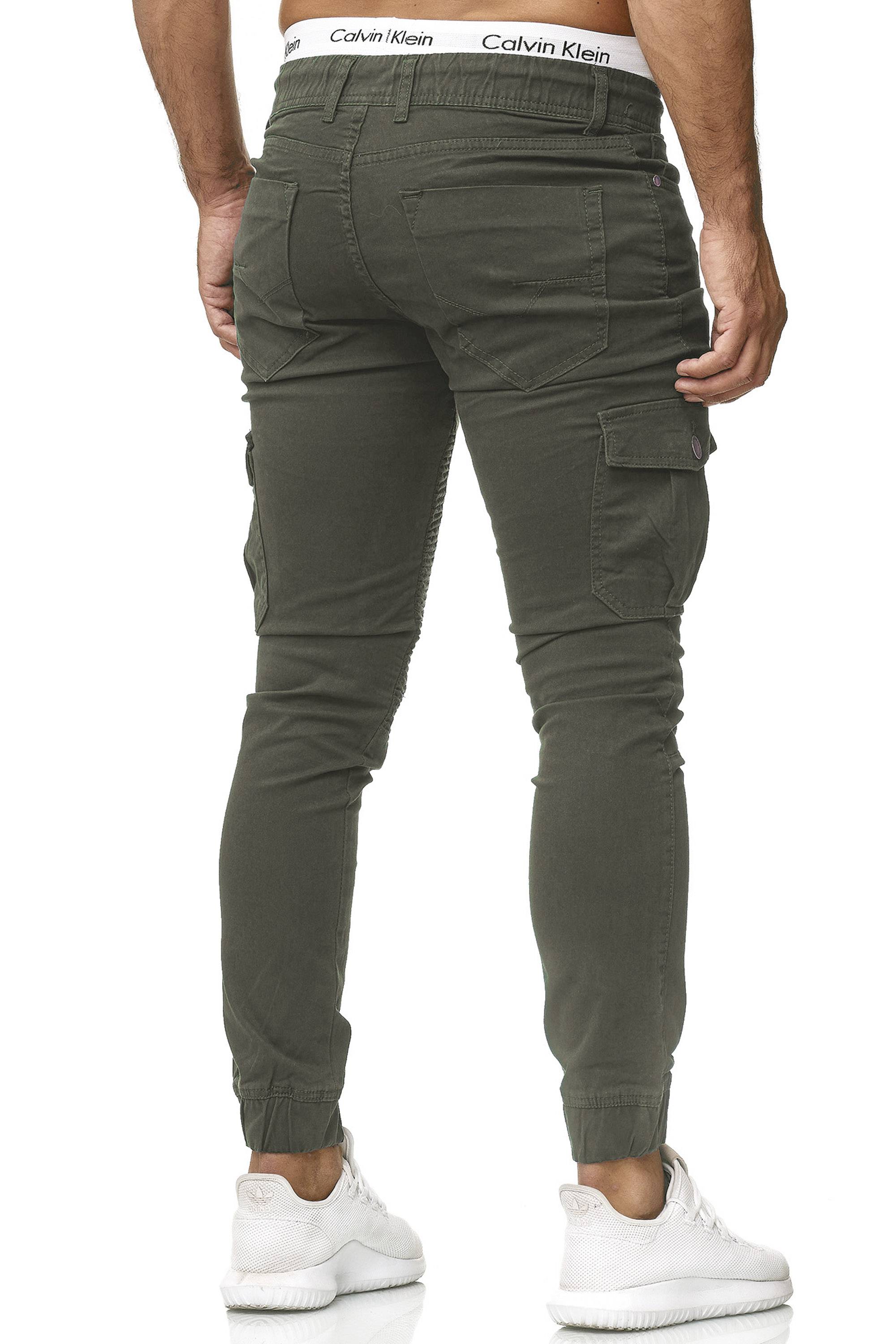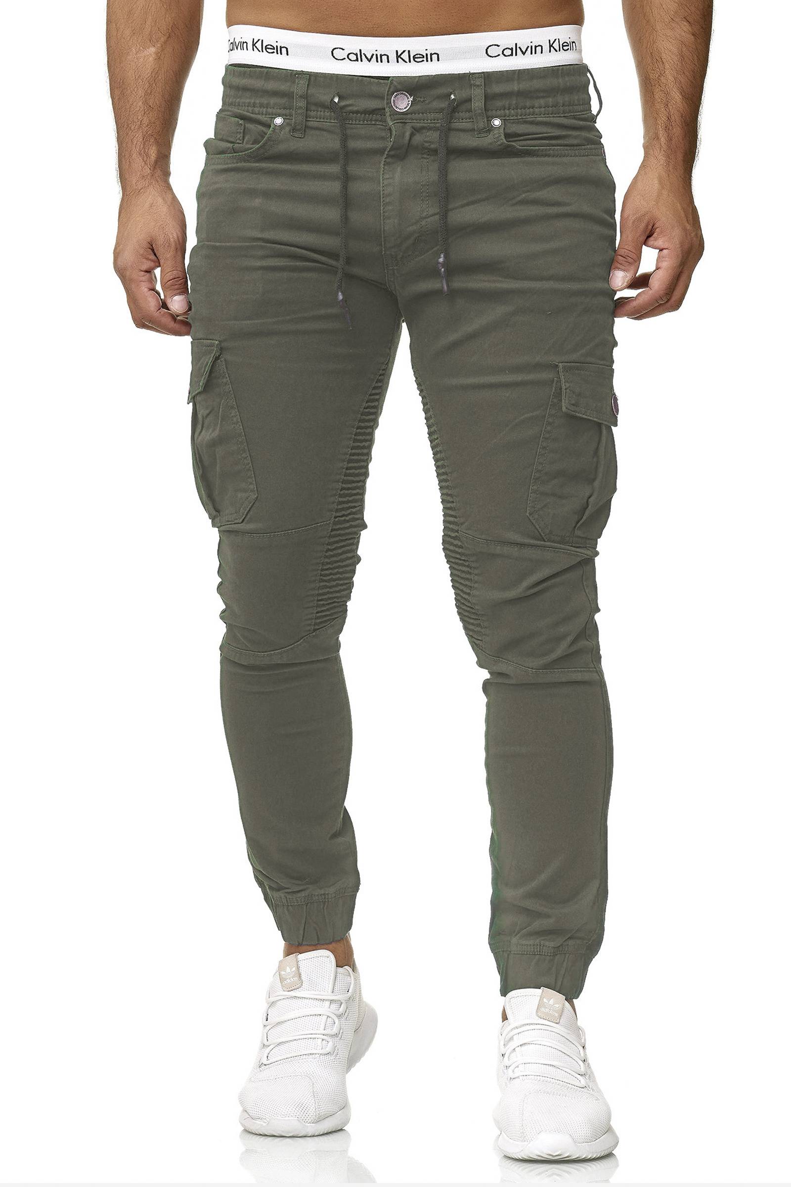 Pantalón JERONE verde. Material cómodo y flexible. Elásticos en puños y cintura, con cordón adicional. Cremallera en la espalda. Bolsillos en los muslos, dos bolsillos delanteros y dos bolsillos traseros. Acolchado motero en la parte delantera. Longitud L32.