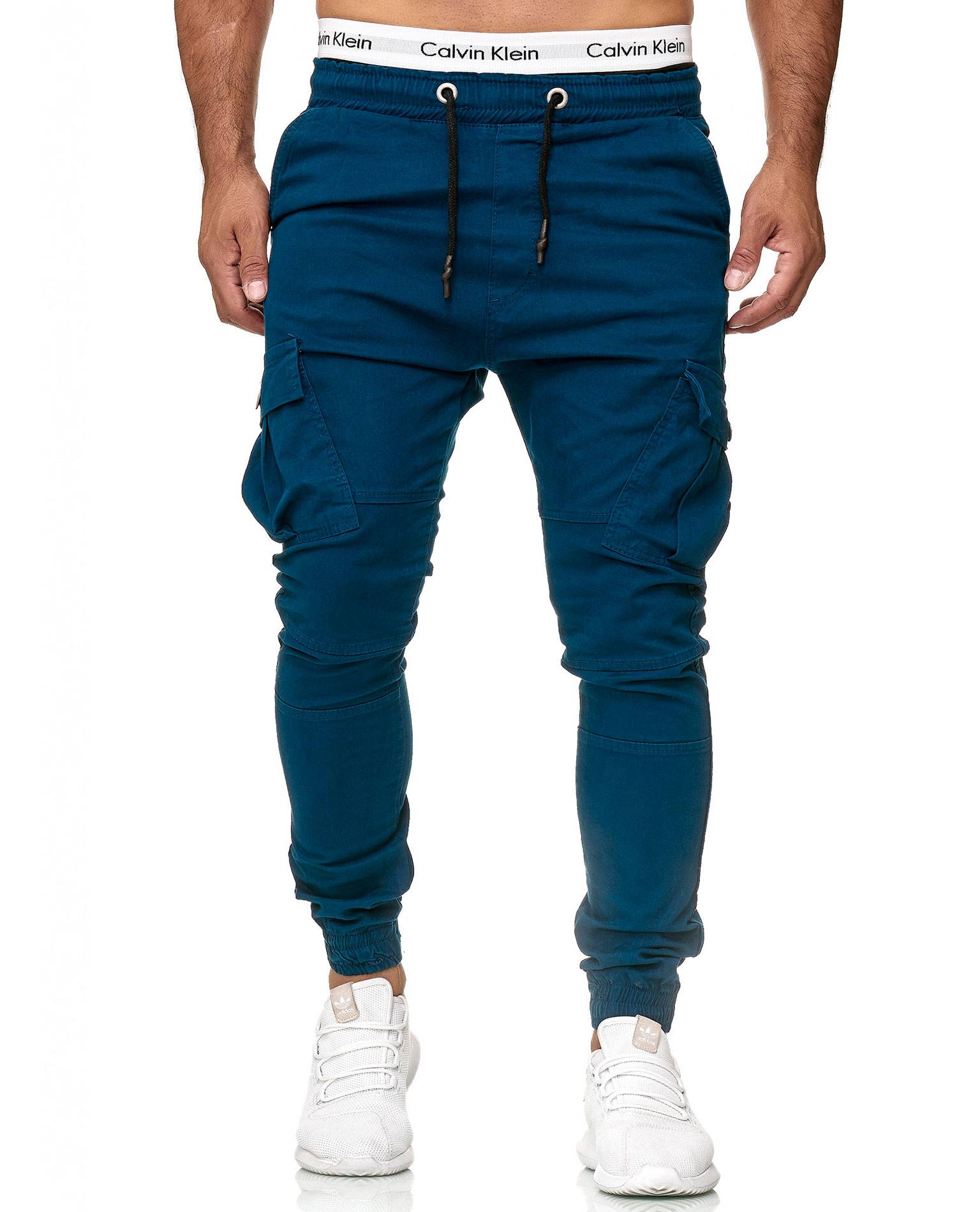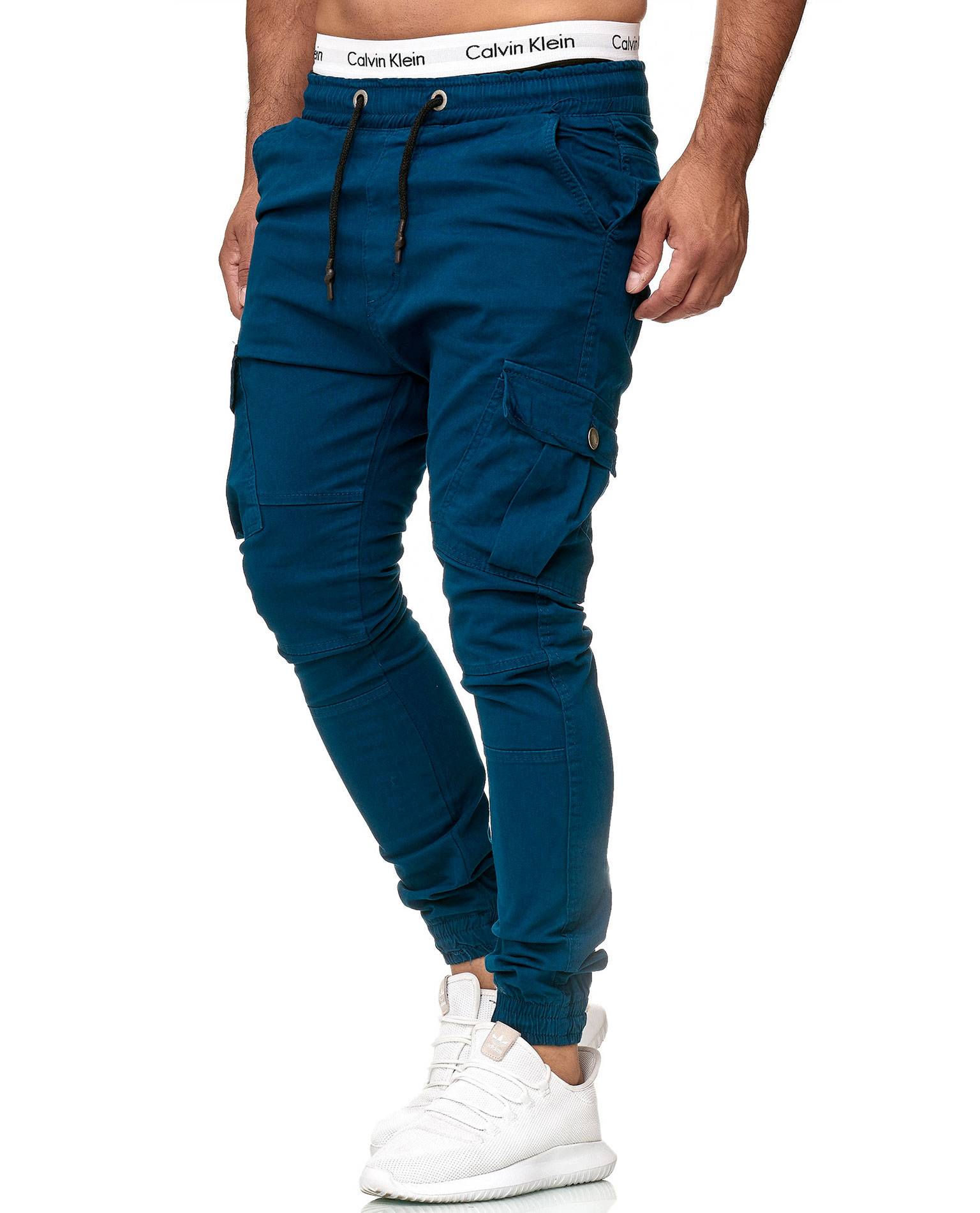 Pantalón JERONE azul oscuro. Material cómodo y flexible. Elásticos en los puños y en la cintura, con cordón adicional. Cremallera en la espalda. Bolsillos en los muslos, dos bolsillos delanteros y dos bolsillos traseros. Longitud L32.