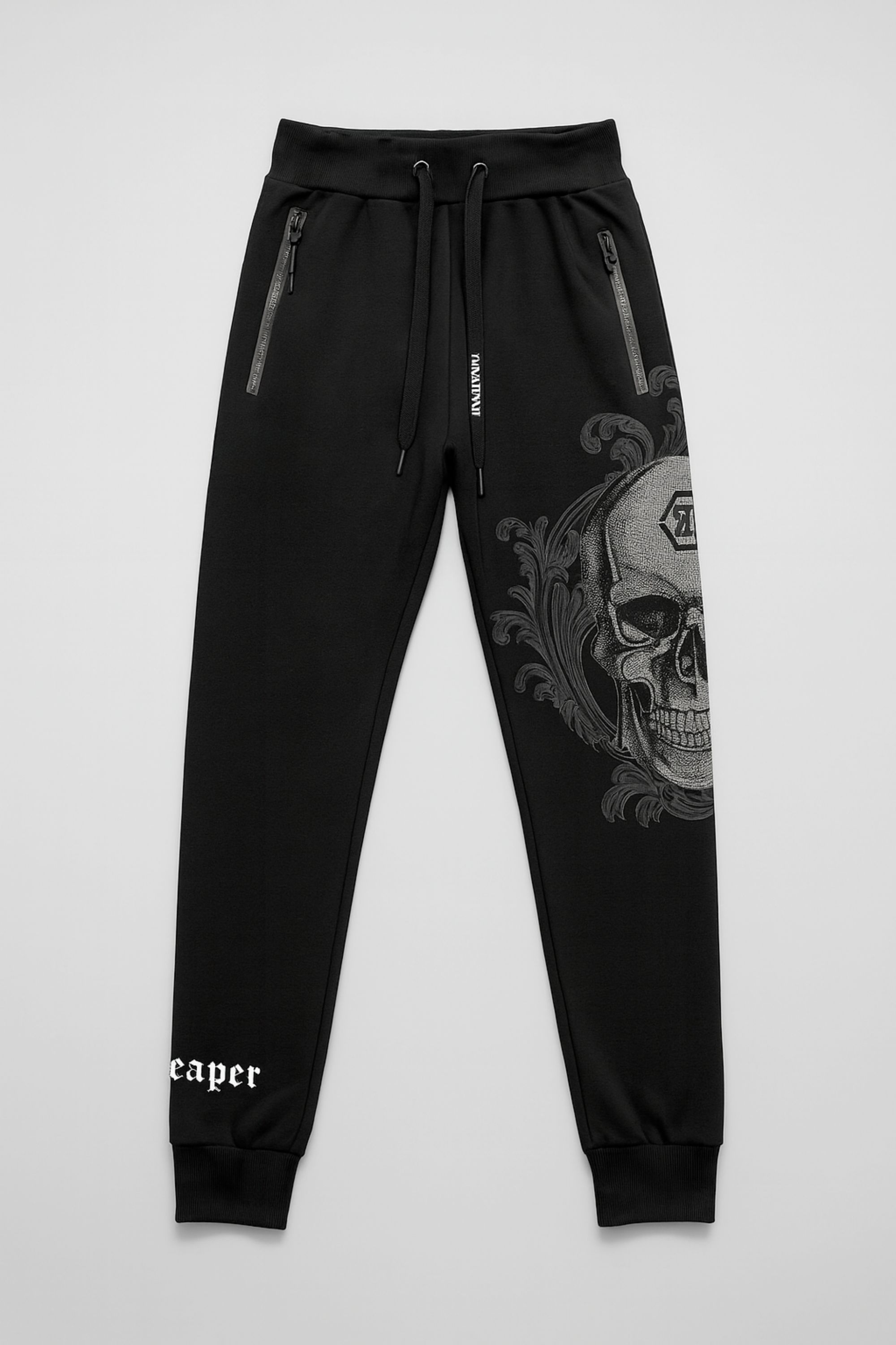 Pantalones de chándal negros para hombre con un llamativo adorno de strass. En el lateral del muslo, una calavera decorada con strass que continúa hacia la parte trasera. Estampado de texto en un puño y costuras decorativas. Dos bolsillos delanteros con cremallera. Cintura con elástico y cordón ajustable. Puños con elástico.