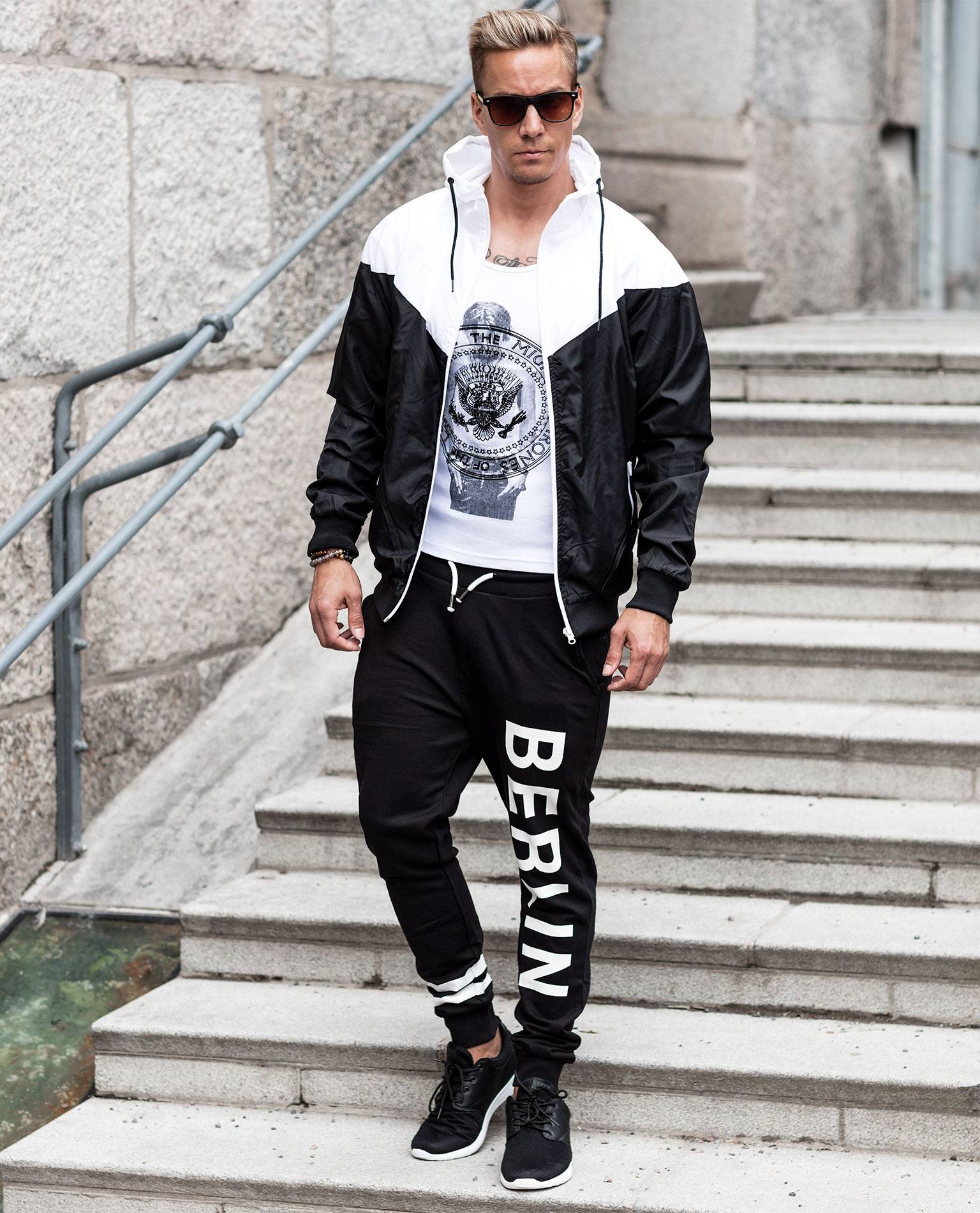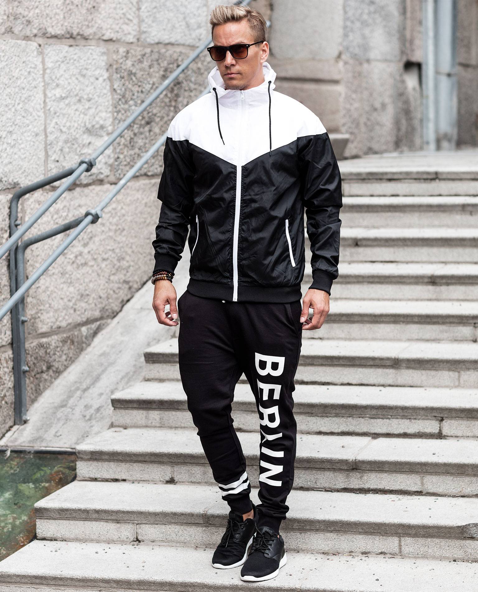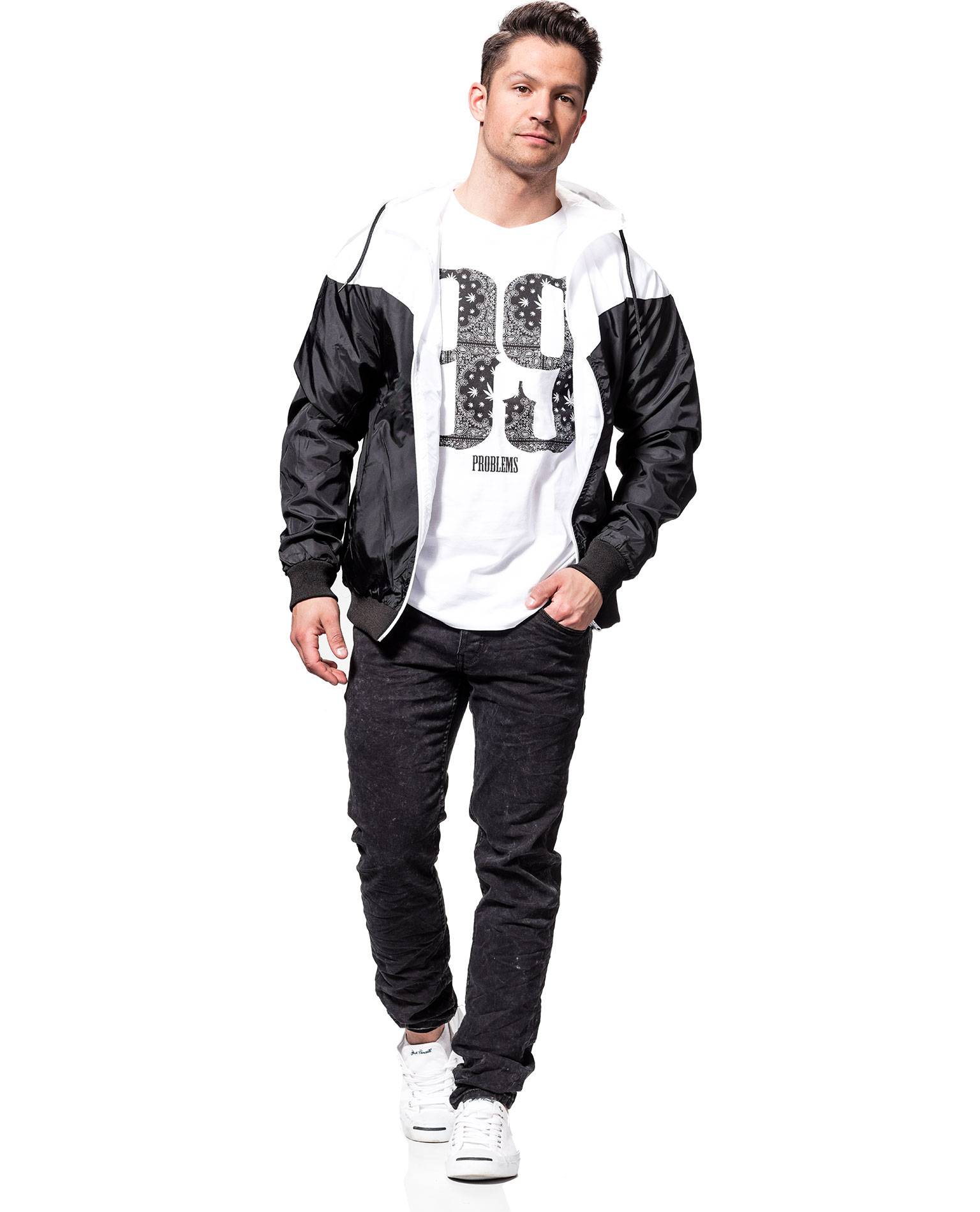 Chaqueta URBAN CLASSICS blanca y negra. Un modelo deportivo ideal para el tiempo libre. Forro interior ligero, cierre de cremallera, capucha y dos bolsillos con cremallera. Dobladillo y mangas elásticos. Cordones en la capucha.